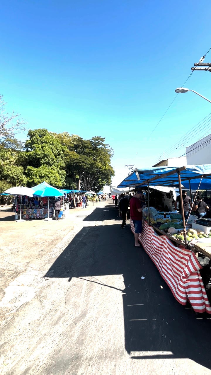 Num dia ensolarado de vento insistente, com um céu tão limpo que vê-se até um avião passando tão alto que não se pode ouvi-lo, há uma rua que se divide entre asfalto, árvores e movimentadas barracas de uma feira em que seus vendedores de conversas simpáticas anunciam alimentos e artesanatos, passam os preços e tiram as dúvidas dos inúmeros clientes que dialogam casualmente e riem. Os diálogos se sobrepõem aos ruídos da cidade e do trânsito, manuseios de sacolas plásticas que guardam as compras e, até mesmo, num determinado momento, um trem passando ao fundo.
