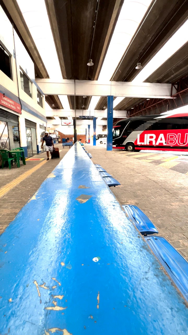 No primeiro e no segundo áudio, os bancos pouco ocupados em frente às plataformas dos ônibus contrastam com as muitas vidas e histórias das pessoas que andam por lá puxando suas malas pesadas com rodinhas barulhentas por girarem rápido tentando acompanhar o ritmo dos passos dos viajantes que ecoam pelo espaço aberto. Os ônibus chegam freando bruscamente ao estacionar, com suas idas e vindas, enquanto a cidade permanece em seu ritmo local de carros e buzinas ao fundo.