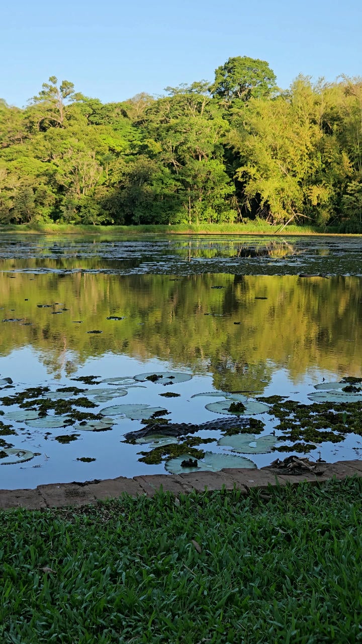 Um lago sereno, que pouco se move com uma leve brisa, é rodeado por árvores e uma cortina de cantos e grunhidos de uma infinidade de pássaros que em alguns momentos ficam escondidos entre as copas, em outros momentos voam por cima do lago. Ora os gorjeios são ansiosos e altos, ora são tranquilos… Um bem-te-vi faz questão de ser identificado com seu inconfundível trilho que apresenta seu nome. E, assim, os diferentes cantos das diferentes espécies se tornam um memorando das vidas e energias presentes na floresta.